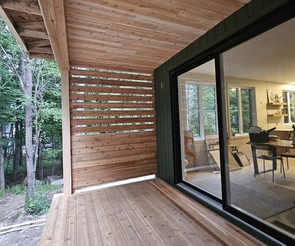 Un revêtement en bois de pin rouge V-joint, offrant chaleur et charme rustique aux lignes authentiques.
