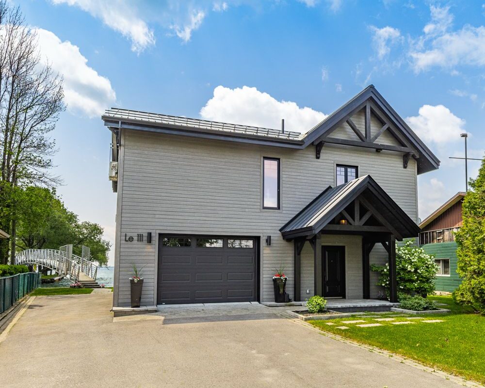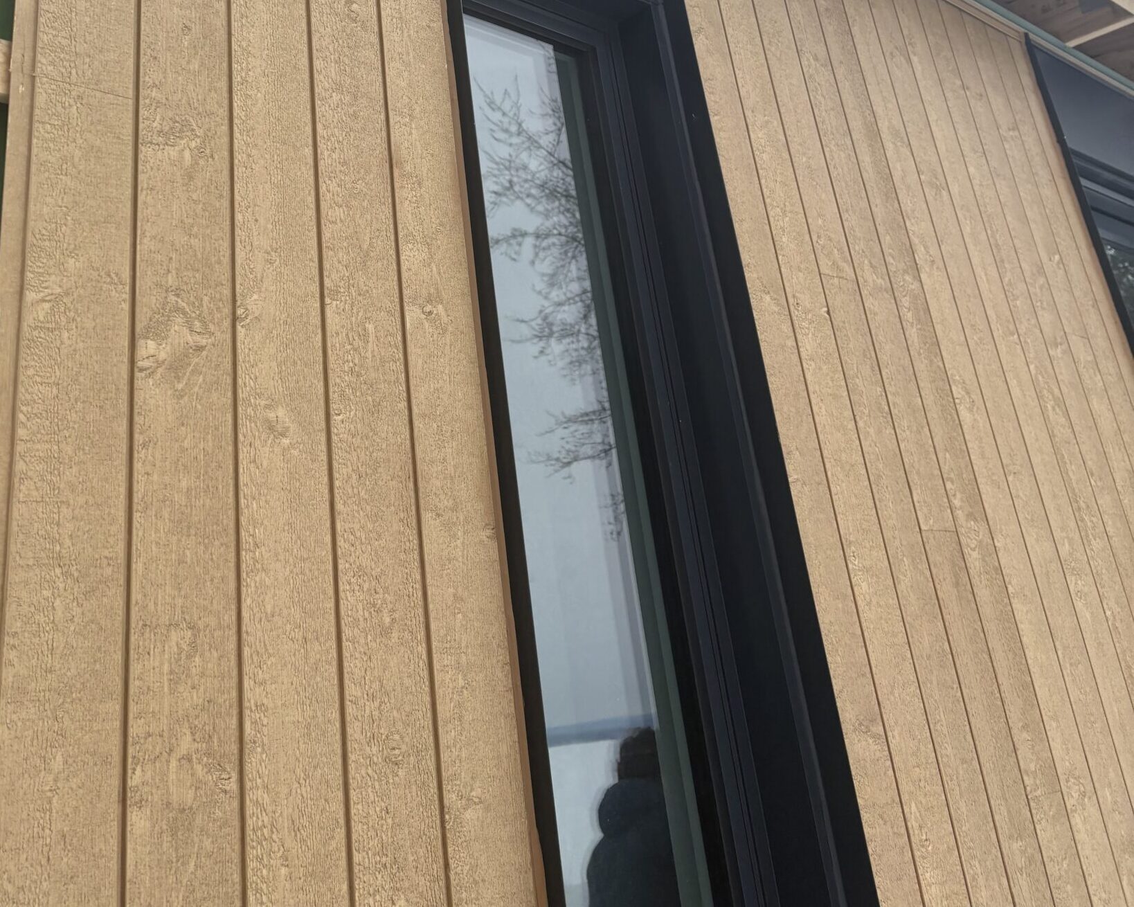 Une élégante façade en planches et couvre-joints gris profonds, inspirée par les teintes apaisantes de la nature environnante.