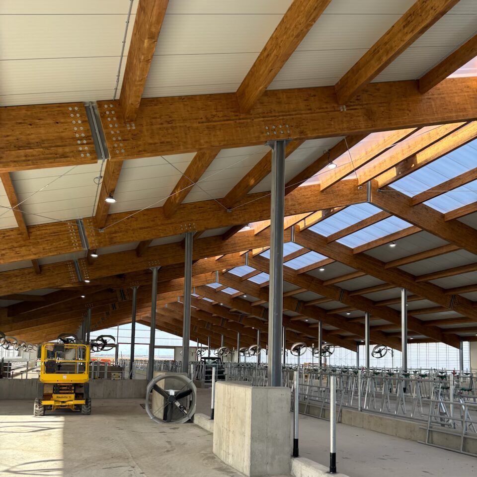 Structure de ferme avec poutres teintées foncées offrant un style rustique et robuste.